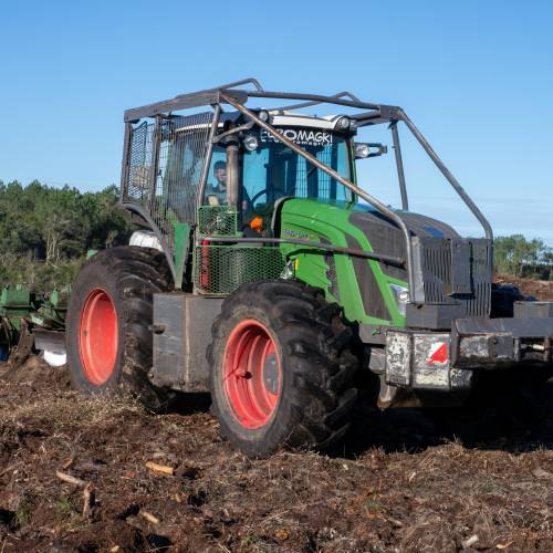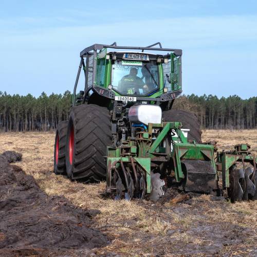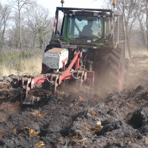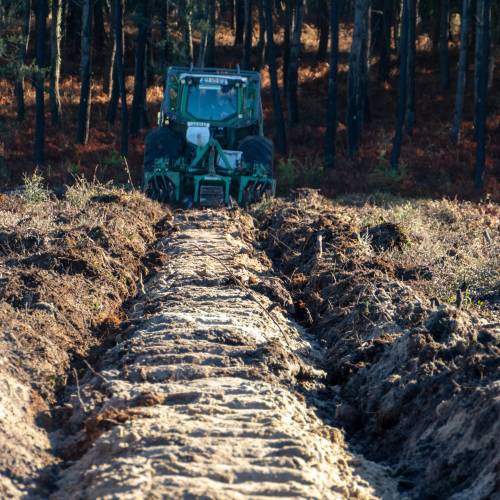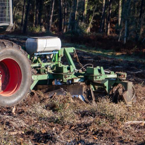 Forest tillage consists in ploughing the soil widely and deeply, thanks to a tool drawn by a tractor.